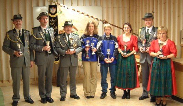 (Bild vlnr. Georg Hubert, Martin Menth, Anton Lang, Kristin Hertlein, Thomas Hertlein, Marion Lechner, Rainer Hehn und Andrea Menth) Den Pokal Luftpistole gewann Andrea Menth (32,3), vor Rainer Hehn (126,6), Marion Lechner (194,7) und Stefan Brückner (205,5). Die sehr gute Jugendarbeit von Martin Menth wurde 2001 mit dem Titel des bayerischen Vizemeisters von Stefanie Rhein und dem 5. Platz von Thomas Hertlein erneut belohnt. So ist es nicht verwunderlich, dass Schützenmeister Georg Hubert optimistisch in die Zukunft seines Vereins blickt.